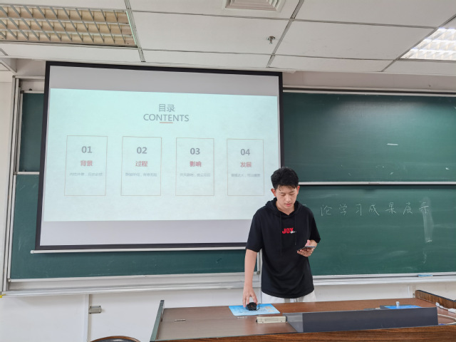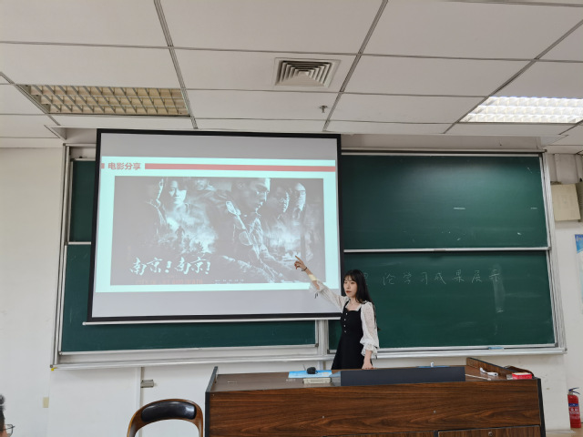 随后,王梦迪围绕抗日战争主题,分局部抗战和全面抗战两个角度梳理抗日战争的时间线,重温历史影片回顾战争经过和损失,论证了为什么中国共产党能带领人民走向胜利,总结抗日战争的历史意义,概括了抗日战争对于中华民族伟大复兴的积极意义,激发了同学们的爱国热情,增强了同学们学好党史的决心。