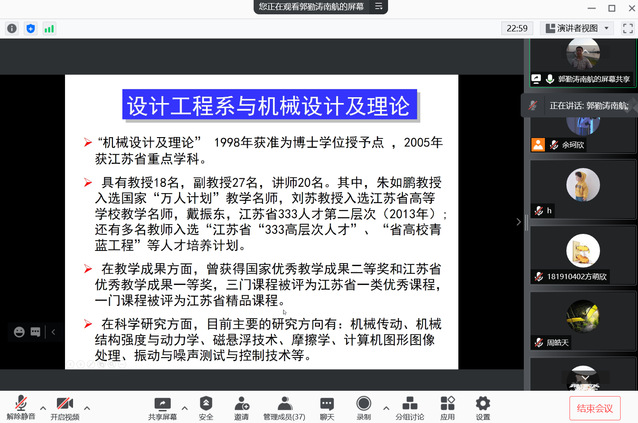 为进一步扩大学院影响,提升学院研究生生源质量,9月28日到9月30日,蜜桃视频 开展了3期线上系部大讲堂活动。本次大讲堂邀请到了设计工程系副主任郭勤涛、机械制造及其自动化系副主任郝秀清、机械电子工程系副主任姚佳烽、航空宇航制造工程系副主任鲍益东和工业设计系主任周海海老师作为主讲人,活动采用线上会议的方式。