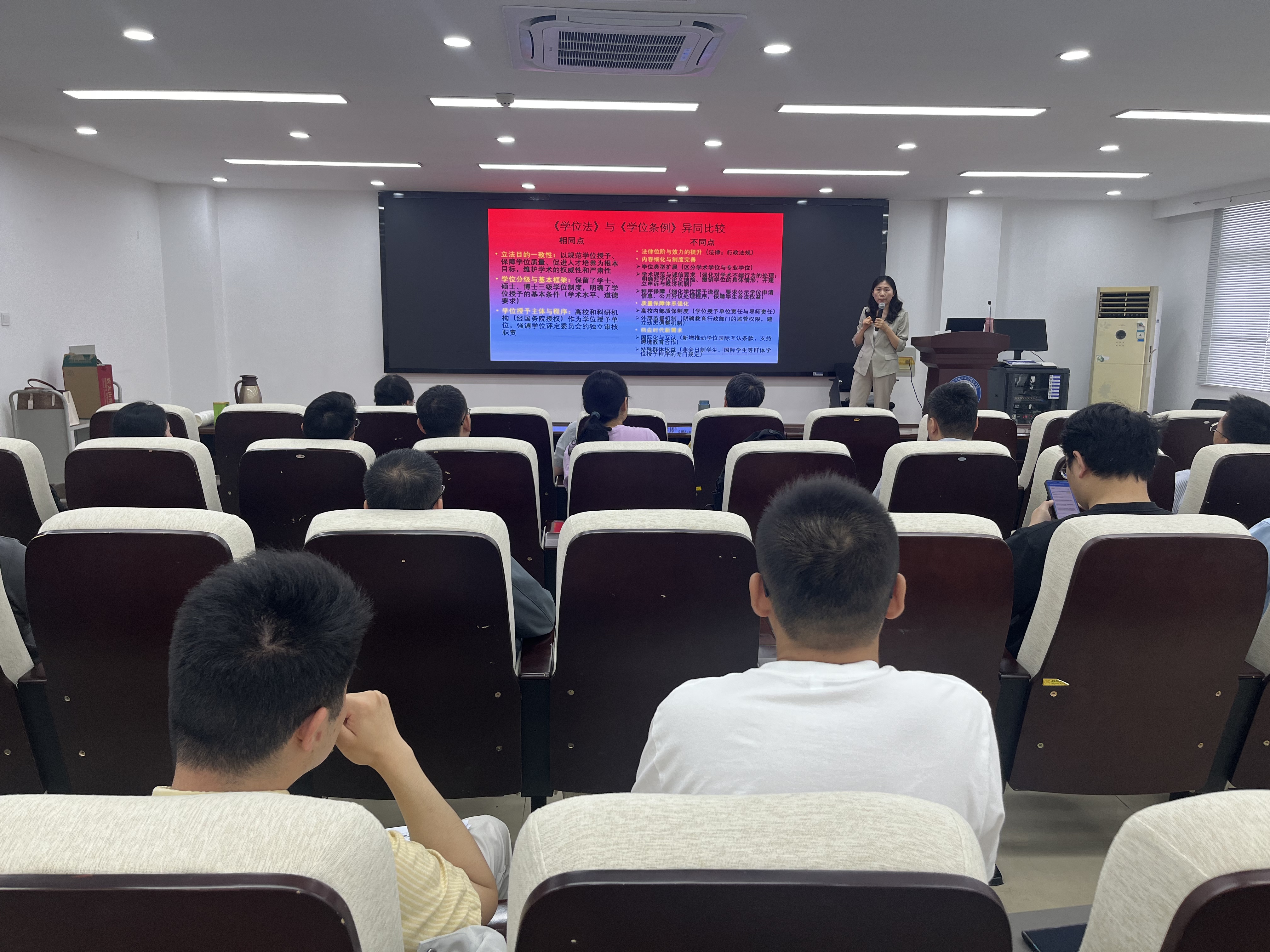尤老师以《中华人民共和国学位法》解读——立德树人视角为题,先梳理学位条例到学位法的立法变迁,简要介绍学位法7个章节并与学位条例对比异同;接着,从立德树人出发,阐述学位法立法目的、宗旨,学位工作原则与任务、学位授予、学位质量保障等模块,强调配备优质导师与建立导师遴选、考核、监督、动态调整机制的重要性;最后,介绍了高等学校预防与处理学术不端行为办法。